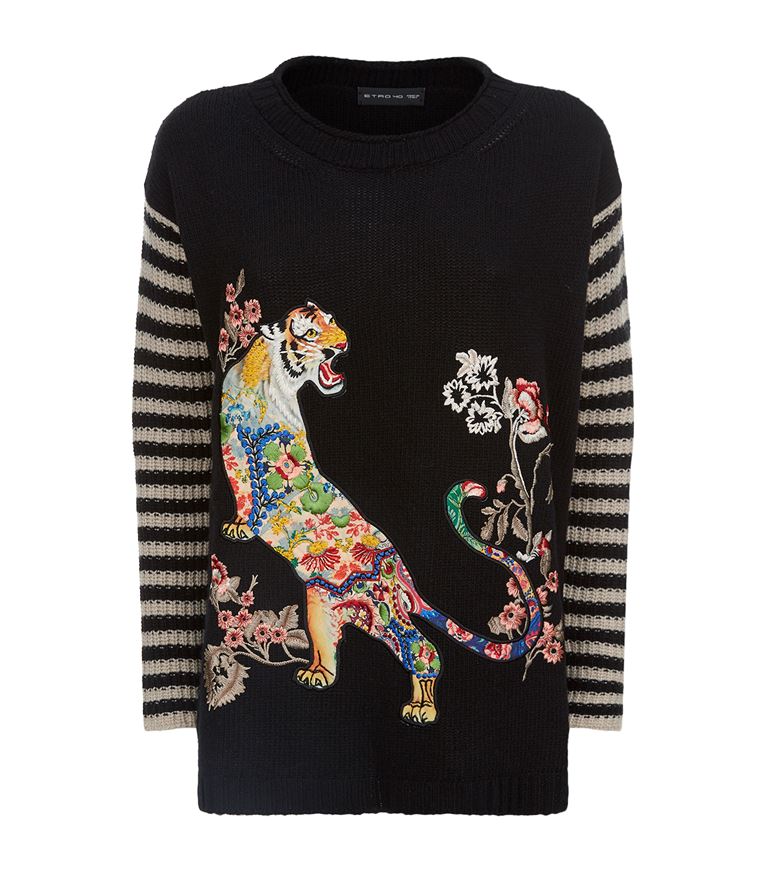 Etro embroidered-tiger-motif-sweater_AW2017 From https://www.harrods.com/en-gb/etro/embroidered-tiger-motif-sweater-p000000000005613855 Published by knitterjules View all posts by knitterjules
