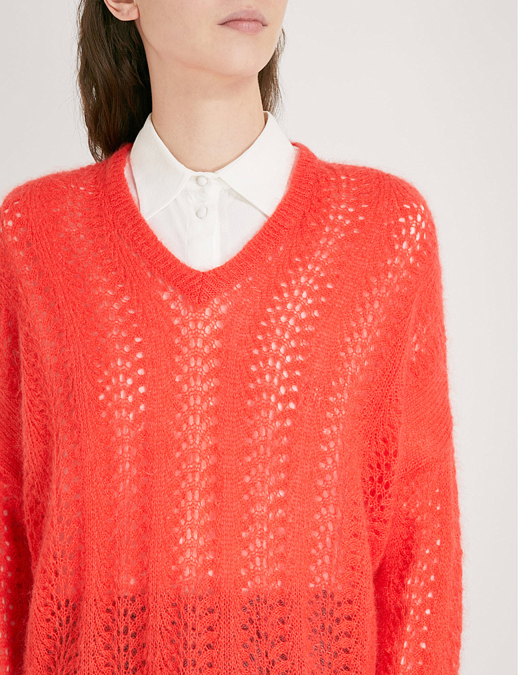 Summer knitwear. Trending fashion. Catwalk fashion. Spring Summer 2018. Lace knitting. Knitting. Summer knitting. Claudie Pierlot V-neck Open-knit Jumper (http://www.selfridges.com/GB/en/cat/claudie-pierlot-v-neck-open-knit-jumper_5005-10150-105M1E18/?previewAttribute=Coral)