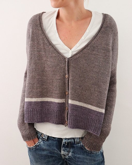 Boxy, cropped cardigan with stripe detail, designed by Isabel Kraemer. Knitting pattern available at ravelry.com. Autumn Winter 2018-2019. New season fashion. Knitting inspiration.