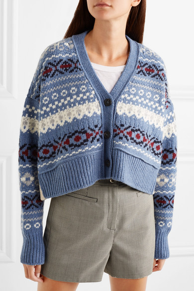 Cropped Fair Isle style cardigan in blue, with cream, red and navy detail, by Prada. Autumn Winter 2018-2019. New season fashion. Knitting inspiration.
