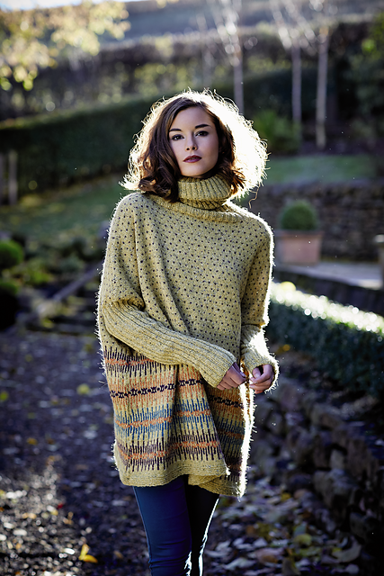 Oversized, stranded colourwork sweater with polo neck and ribbed sleeve detail. Designed by Galina Carroll. Knitting pattern available from Rowan: 40 Years: 40 Iconic Designs. Autumn Winter 2018-2019. New season fashion. Knitting inspiration.