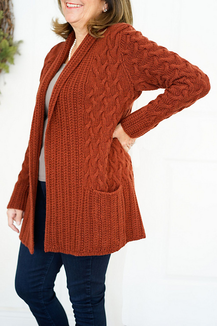 Oversized cardigan with all-over cable texture and shawl collar, designed by Lori Versaci. Photo copyright Chrissie Knight for VERSACIKNITS 2017. Pattern available at ravelry.com. Autumn Winter 2018-2019. New season fashion. Knitting inspiration.
