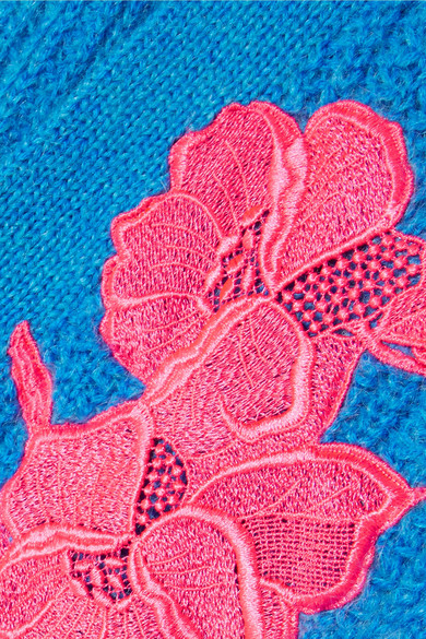Detail of pink floral applique from Christopher Kane oversized blue cardigan. New season fashion. Knitting inspiration. Designer fashion.
