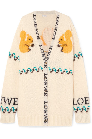 Loewe oversized cardigan with intarsia squirrels and logo features. Available from net-a-porter.com. Autumn Winter 2018-2019. New season fashion. Knitting inspiration. New trends for winter 2018-2019.