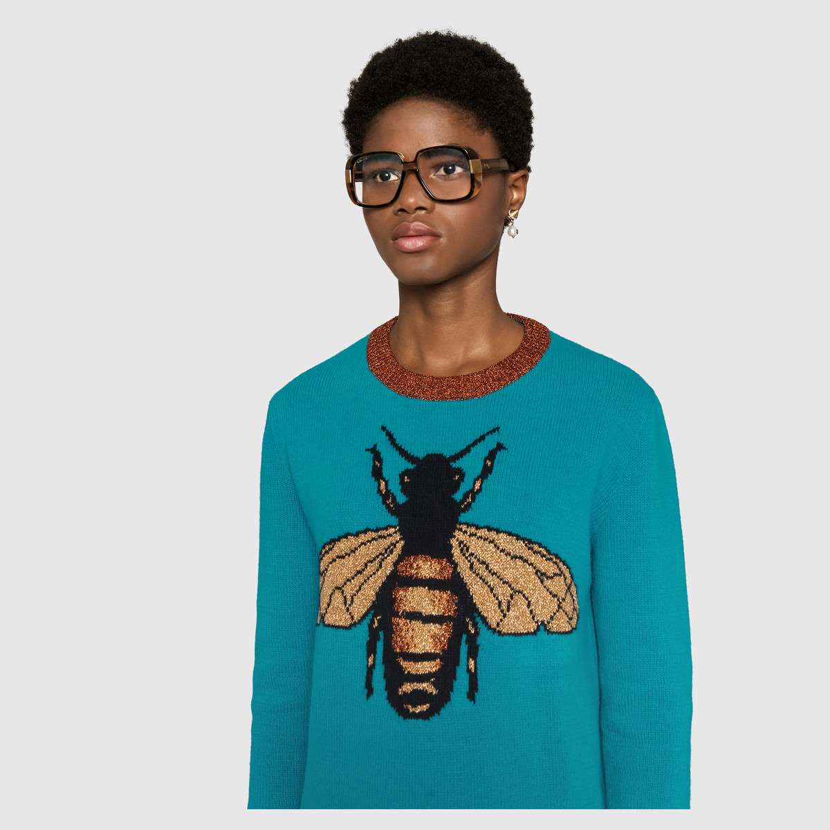 Gucci turquoise wool sweater with intarsia bee motif with brown trim. From gucci.com. Autumn Winter 2018-2019. New season fashion. Knitting inspiration. New trends for winter 2018-2019.