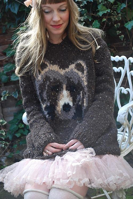 Oversized, slouchy sweater with brown bear intarsia motif, with hood option, designed by tiny owl knits. Knitting pattern available from ravelry.com. Knitting inspiration. Knitting intarsia. Autumn Winter 2018-2019.