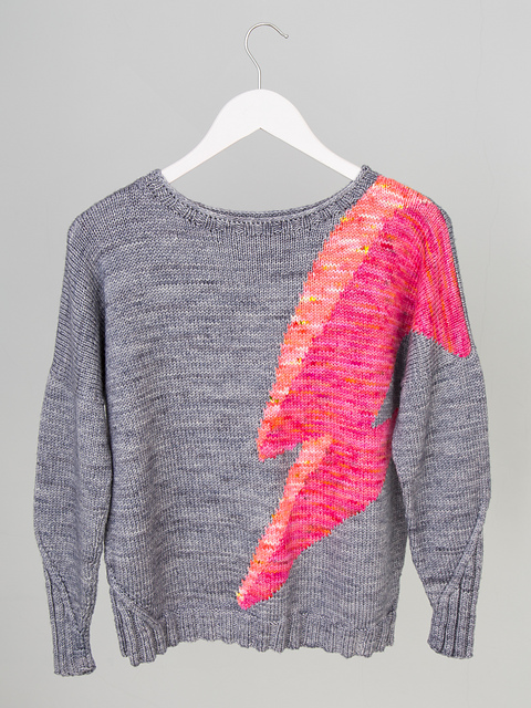Oversized sweater with lighting bolt motif in intarsia, designed by Sue Stratford. Knitting pattern available from ravelry.com. Knitting inspiration.