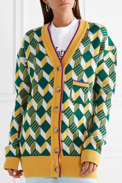 AlexaChung oversized, v-neck cardigan with all-over, geometric intarsia design in green, white, yellow and burgundy, with contrast edge in yellow and burgundy. Autumn Winter 2018-2019. New season fashion. Knitting inspiration. New trends for winter 2018-2019.