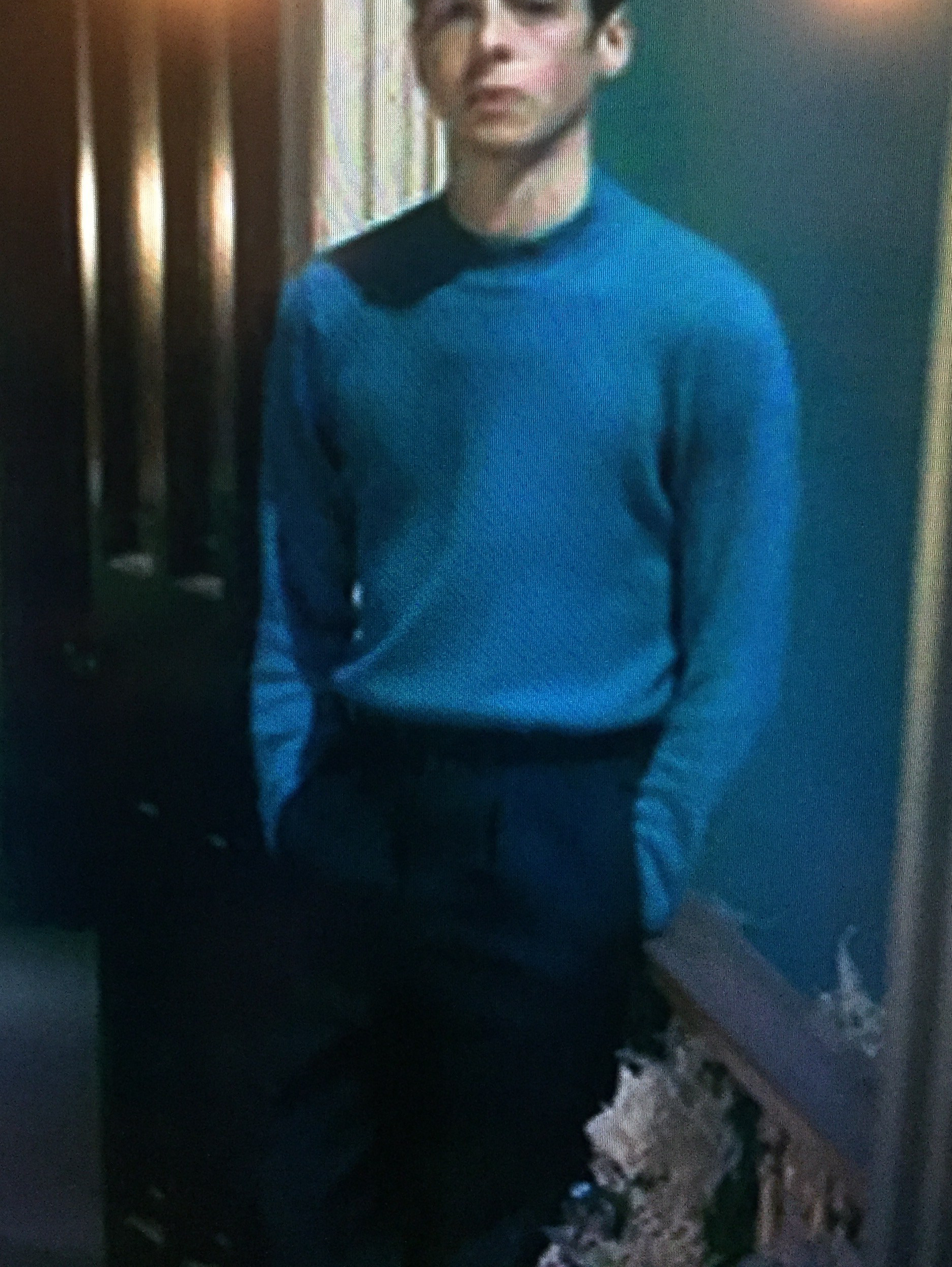 Anthony Boyle as Jack Argyll in Ordeal by Innocence (BBC 2018) wearing sleek, turtleneck jumper/sweater. 1950s style. Beatnik. Knits on screen. Knitwear on screen.